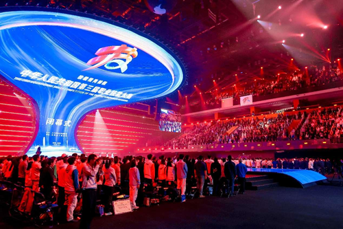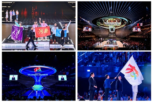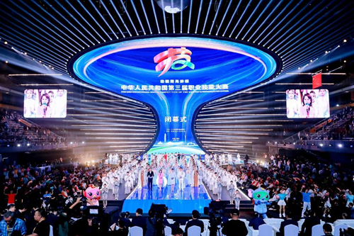 華燈璀璨,掌聲如潮。9月23日晚,當348名獲獎選手高舉隊旗與獎?wù)拢敶筚悤煸阼驳奈枧_上完成交接傳遞,當良渚文化和人形機器人在現(xiàn)場8000余名觀眾的歡呼聲中共舞……中華人民共和國第三屆職業(yè)技能大賽閉幕式在鄭州奧體中心體育館完美落幕!