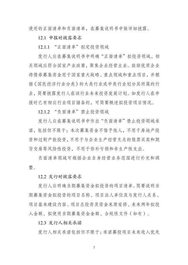 (二)申報材料應(yīng)明確債券募集資金禁止投向領(lǐng)域,形成“負(fù)面清單”。“負(fù)面清單”包括但不限于:將募集資金借予他人,用于房地產(chǎn)投資和過剩產(chǎn)能投資,用于與企業(yè)生產(chǎn)經(jīng)營無關(guān)的股票買賣和期貨交易等風(fēng)險性投資,用于彌補虧損和非生產(chǎn)性支出。“負(fù)面清單”領(lǐng)域可根據(jù)企業(yè)自身經(jīng)營業(yè)務(wù)范圍進行補充和調(diào)整。